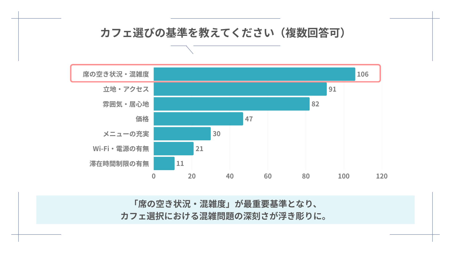 77%が「満席で空いているカフェが見つけにくい」と回答。カフェの数が問題なのではなく、「どこが空いているか分からない」という情報の不在が最大の課題です。