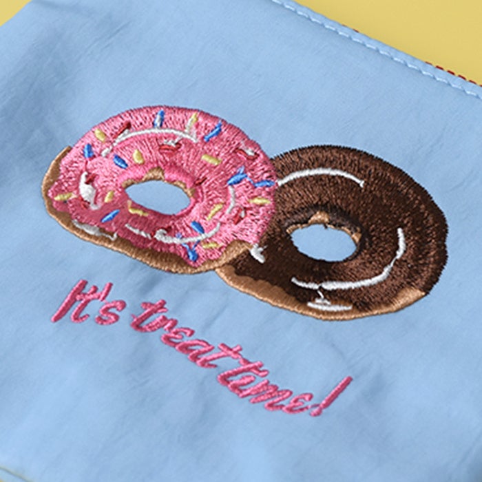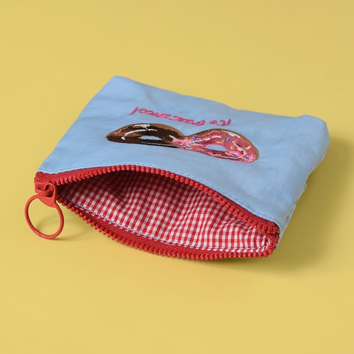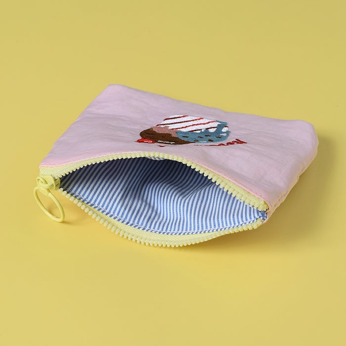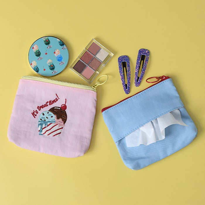使いやすいサイズ感のフラットポーチ裏面には、ポケットティッシュが入れられて便利!モチーフと英文字は全面刺繍でリッチな仕上がり♪