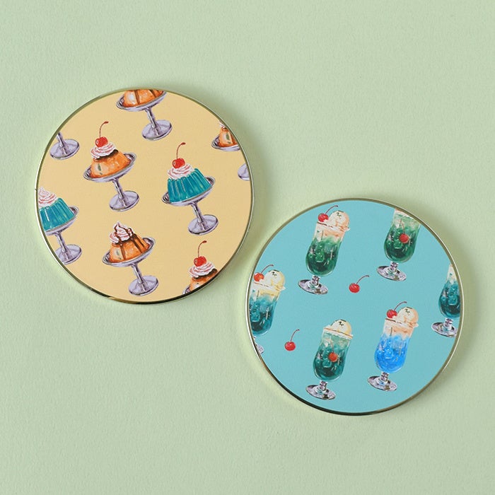メイク直しにもちょうどいいサイズの軽量コンパクトミラー!油絵タッチのリアルな”クリームソーダ”や”プリンアラモード”のイラストが昭和レトロな純喫茶を思い出させるデザイン♪片面が等倍鏡、もう片面が拡大鏡になっています。