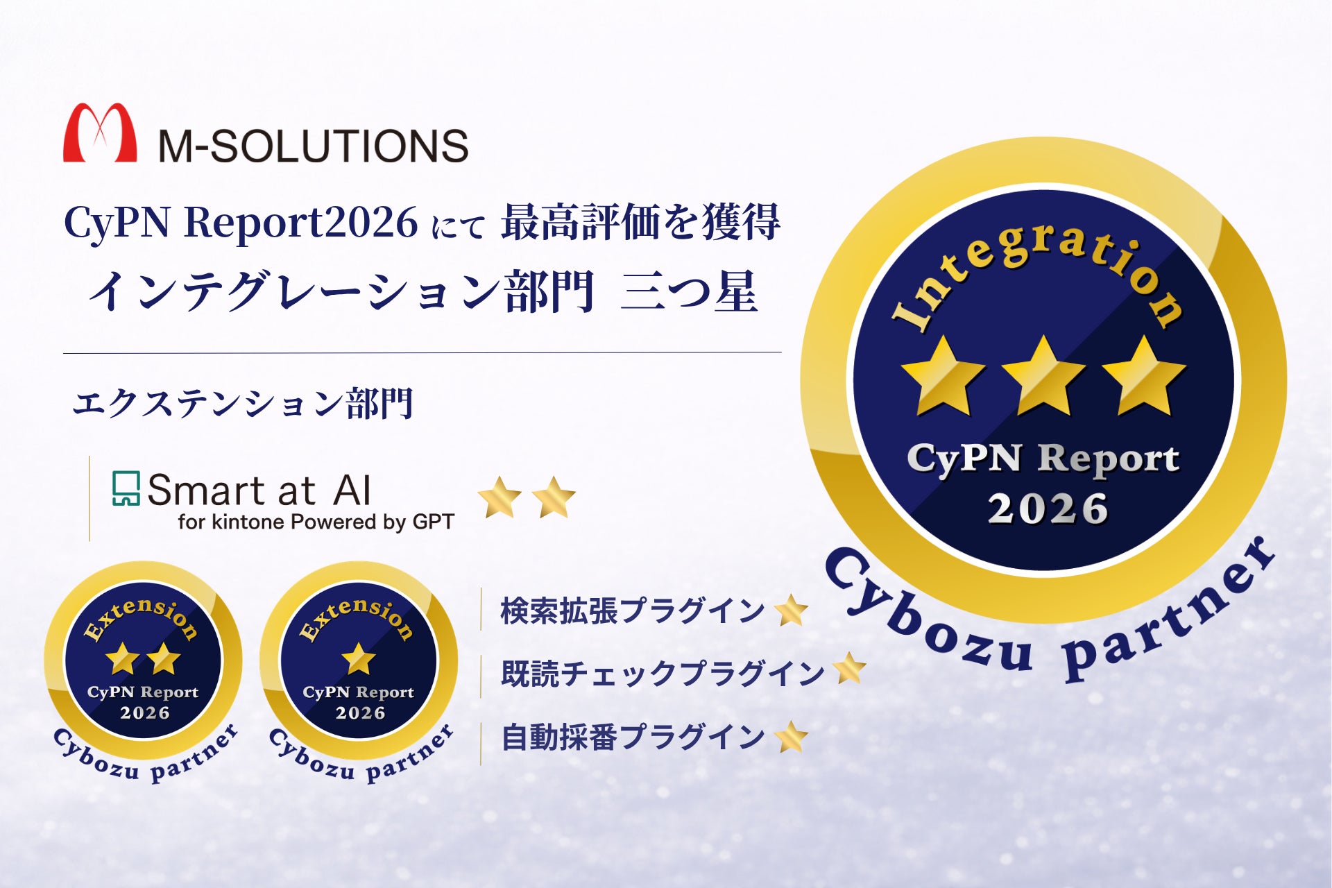 M-SOLUTIONS株式会社(本社:東京都豊島区、代表取締役社長CEO:植草 学、以下「M-SOLUTIONS」)は、サイボウズ株式会社(本社:東京都中央区、代表取締役社⻑:⻘野 慶久、以下サイボウズ)のオフィシャルパートナー評価制度である「Cybozu Partner Network Report 2026」(以下「CyPN Report 2026」)にて、インテグレーション部⾨で2年連続となる最高評価の三つ星を獲得したことをお知らせいたします。