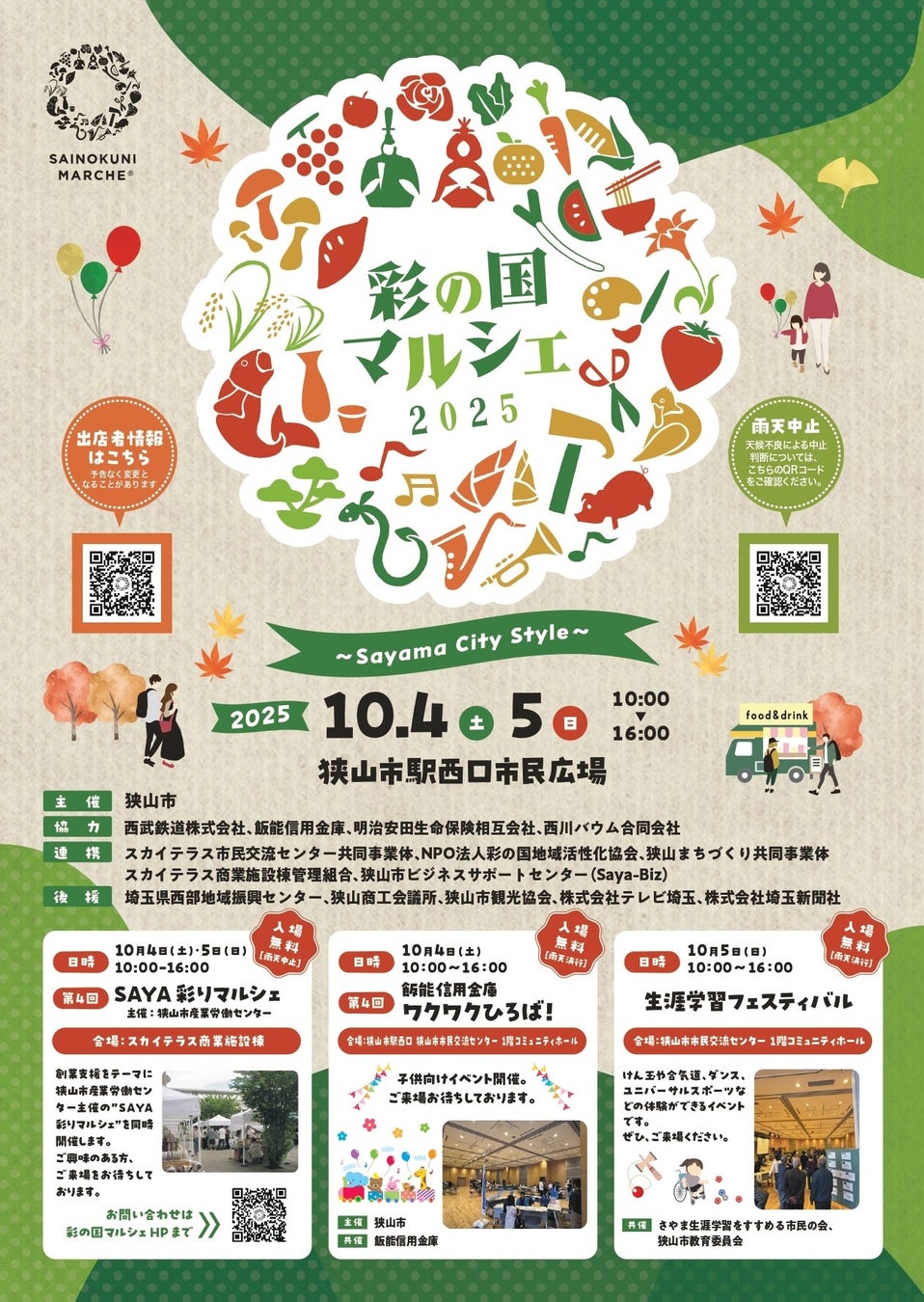 NPO法人 彩の国地域活性化協会(拠点:埼玉県さいたま市、代表理事:佐々木 輝伸)が主催する「彩の国マルシェ」は、2025年10月4日と5日の2日間、埼玉県狭山市にある「狭山市駅西口市民広場」にて「彩の国マルシェ~Sayama City Style~」を、狭山市産業労働センターにて「SAYA彩りマルシェ~Produced by SAINOKUNI MARCHE~」を同日開催いたします。