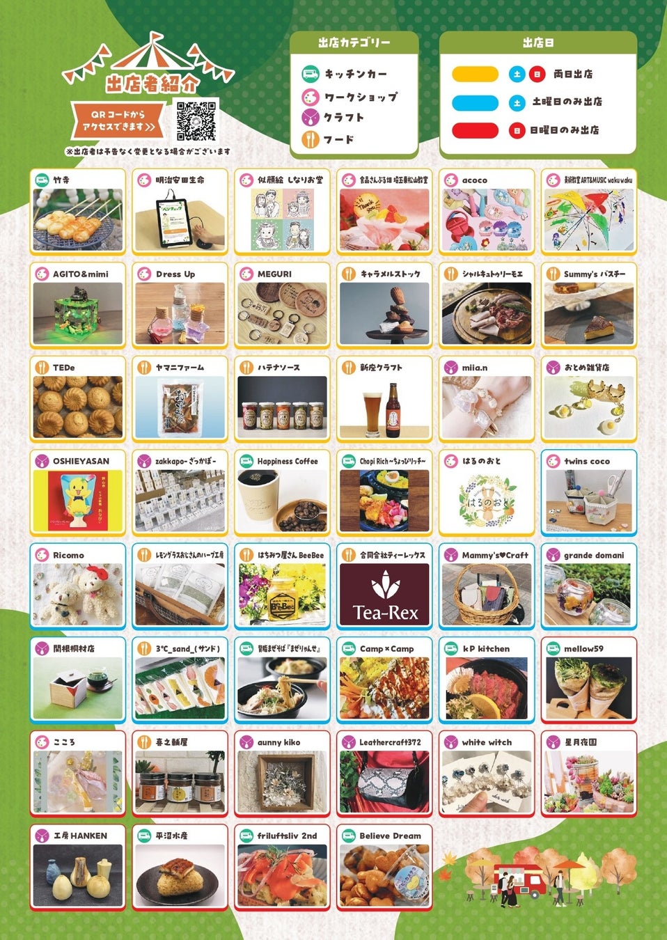 出店店舗:両日で50店舗出店(キッチンカー12台、フード12店舗、クラフト12店舗、ワークショップ13店舗、野菜1店舗)