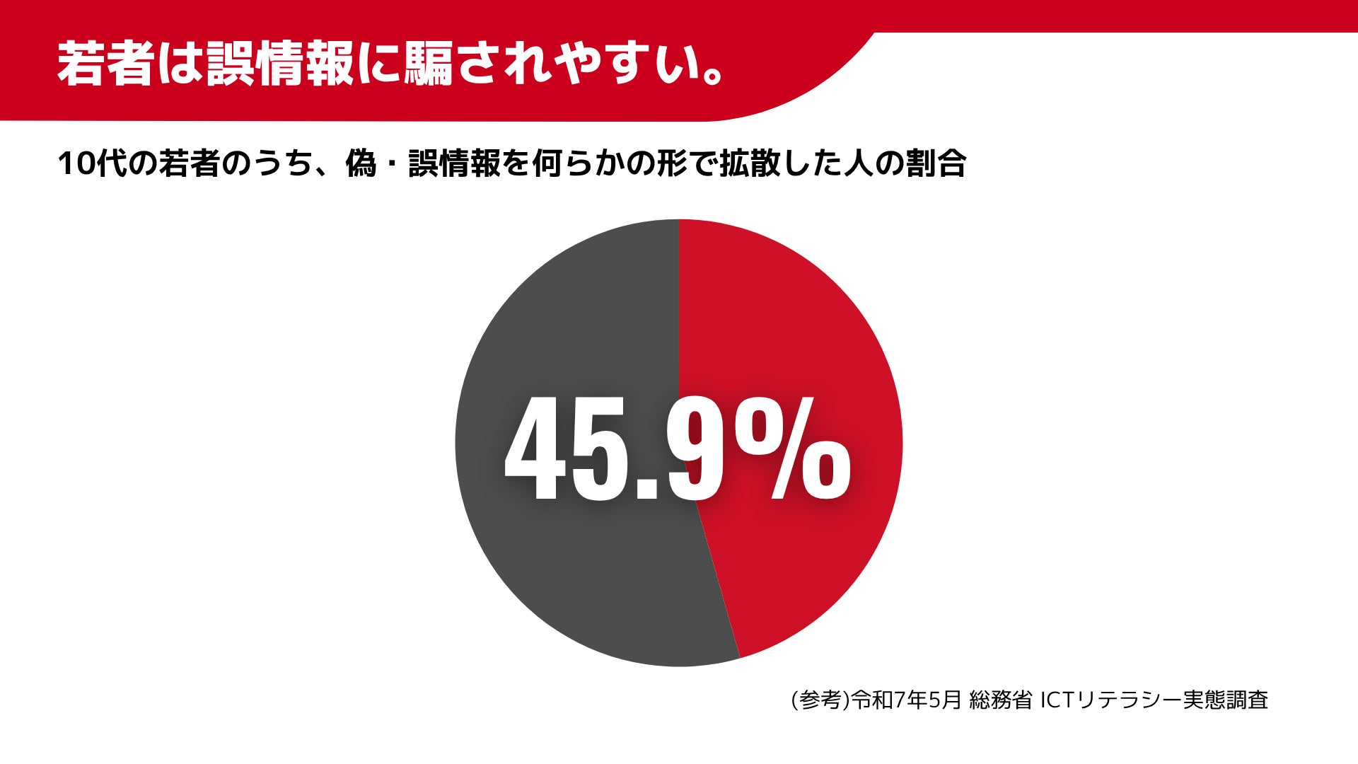 とくに10代は、誤った情報を“信じる”だけでなく、“拡散する”リスクも高い世代です。令和7年度の総務省の調査によると、10代の約46%が「偽・誤情報を拡散したことがある」と回答しており、これは全年齢の平均(約25%)を大きく上回る数値となっています。