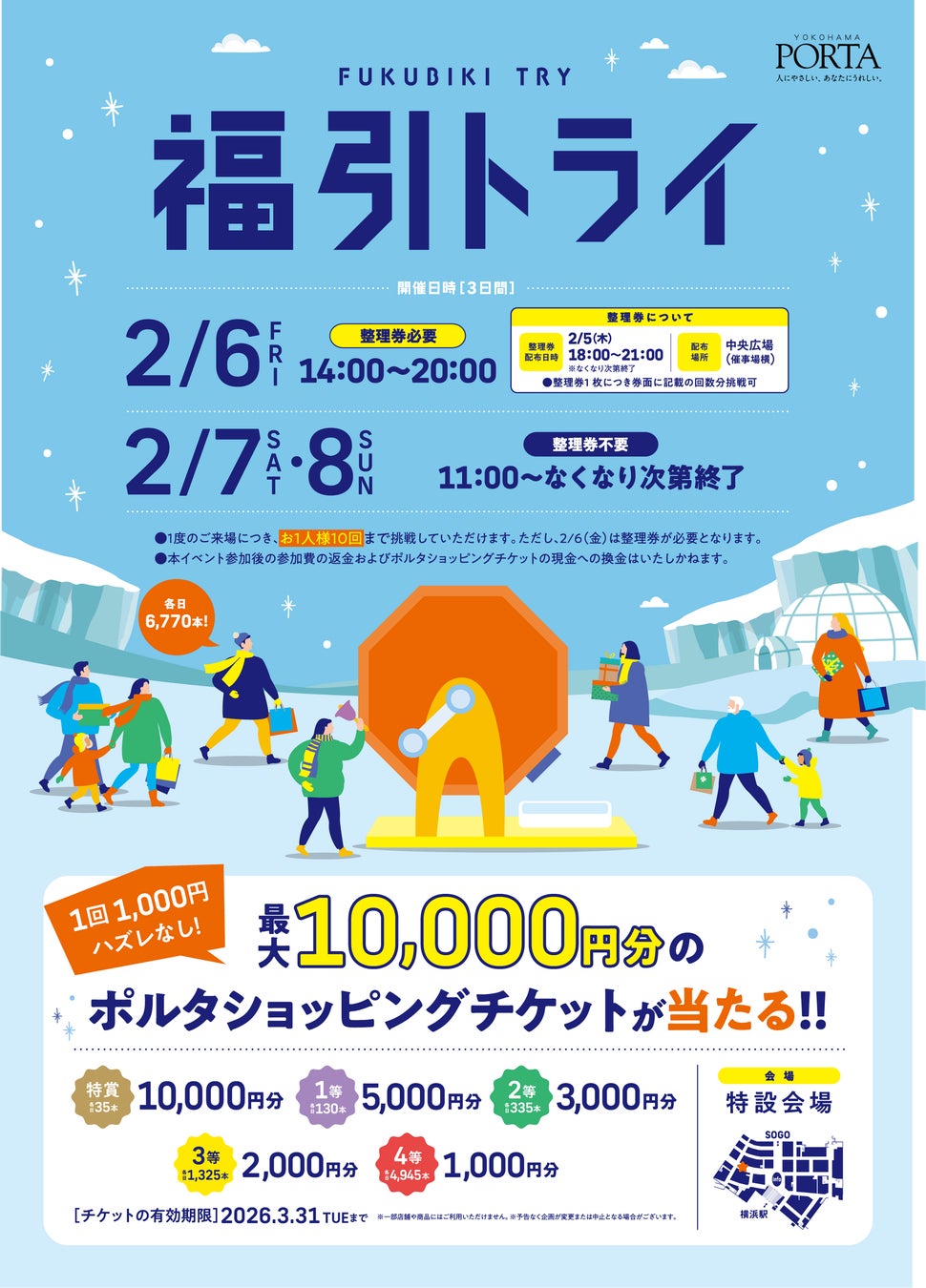 横浜新都市センター株式会社(横浜市西区高島2丁目12番6号/取締役社長 原田 一之)が運営・管理する横浜駅東口地下街ポルタでは2026年2月6日(金)から2月8日(日)の3日間限定で横浜ポルタ各店でのお買物・お食事に使えるポルタショッピングチケットが当たる抽選会「福引トライ」を開催いたします。