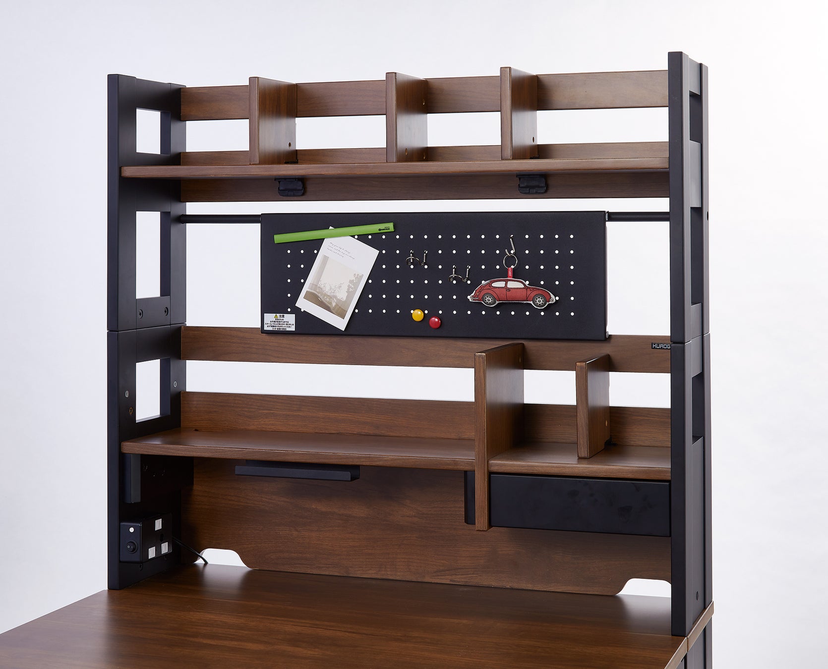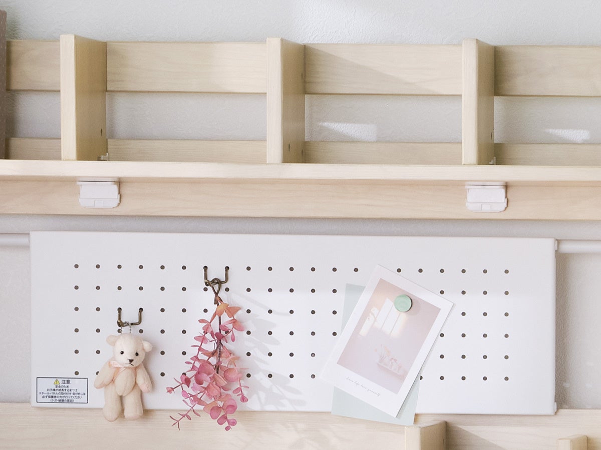 「THE DESK CD(ハイタイプ)」に付属する多機能スチールパネルは、有孔ボードとしての使用が可能です。フックを使った小物の吊り下げや、マグネットを使ったメモの貼り付け、市販のマグネット収納を使用することができます。また、このパネルは必要に応じて棚板としても活用できる実用的な設計です。