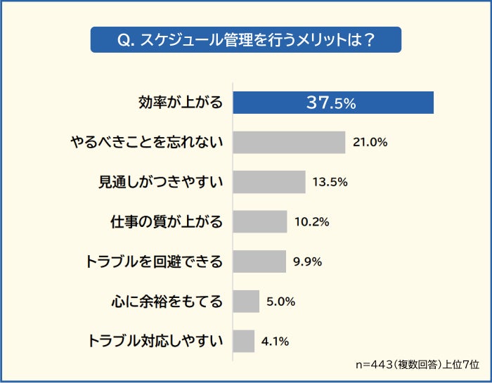 「スケジュール管理を行うメリット」を聞いたところ、もっとも多かった回答は「効率が上がる(37.5%)」でした。2位「やるべきことを忘れない(21.0%)」も多くの票を集めています。