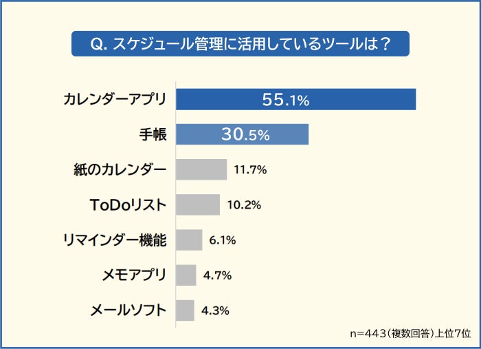 「スケジュール管理のために活用しているツール」のダントツは1位の「カレンダーアプリ(55.1%)」で、全体の半数以上を占めました。