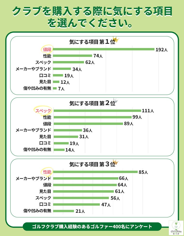 クラブ購入時に最も重視する項目として、「価格」を挙げた回答者が192人(48%)と最も多い結果となりました。