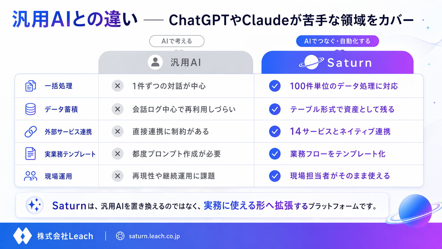 ChatGPTやClaudeのような汎用AIは万能ですが、業務データの一括処理、蓄積、外部サービスとの連携は得意としていません。Saturnはその領域を補完します。