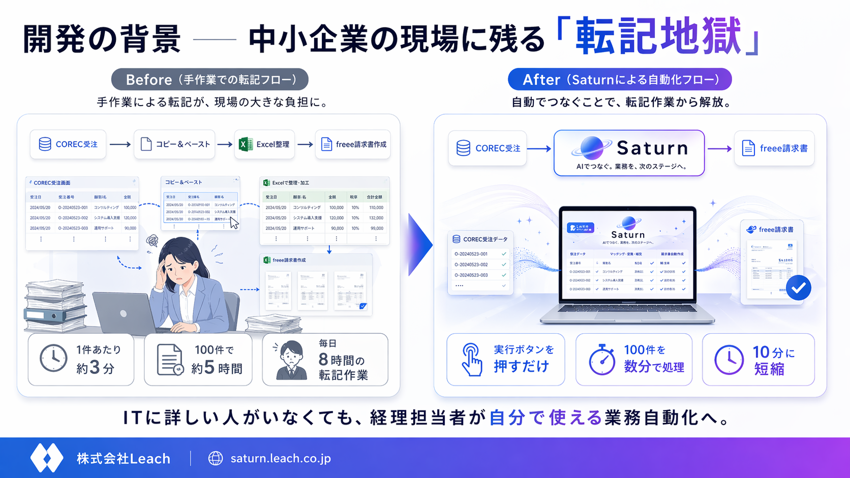 株式会社Leach(本社:東京都港区、代表取締役:冨永 拓也)は、AI搭載テーブル型業務自動化プラットフォーム「Saturn」を2026年4月24日に正式リリースしました。