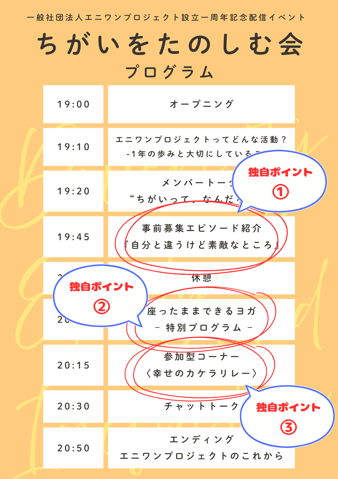 一般社団法人エニワンプロジェクト(本社:東京都練馬区、代表理事:狐崎友希)は、2025年11月29日(土)に一般社団法人設立1周年記念イベント【ちがいをたのしむ会】をZOOM配信にて開催しました。