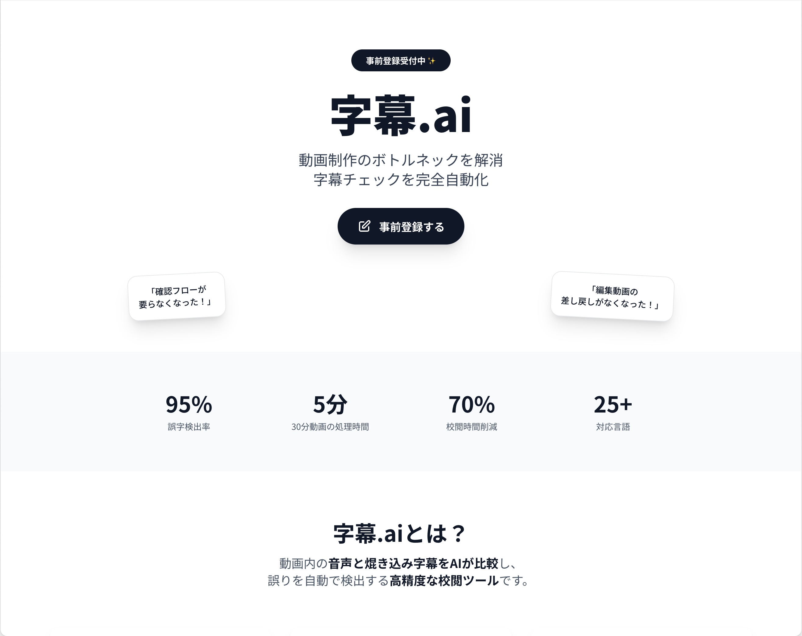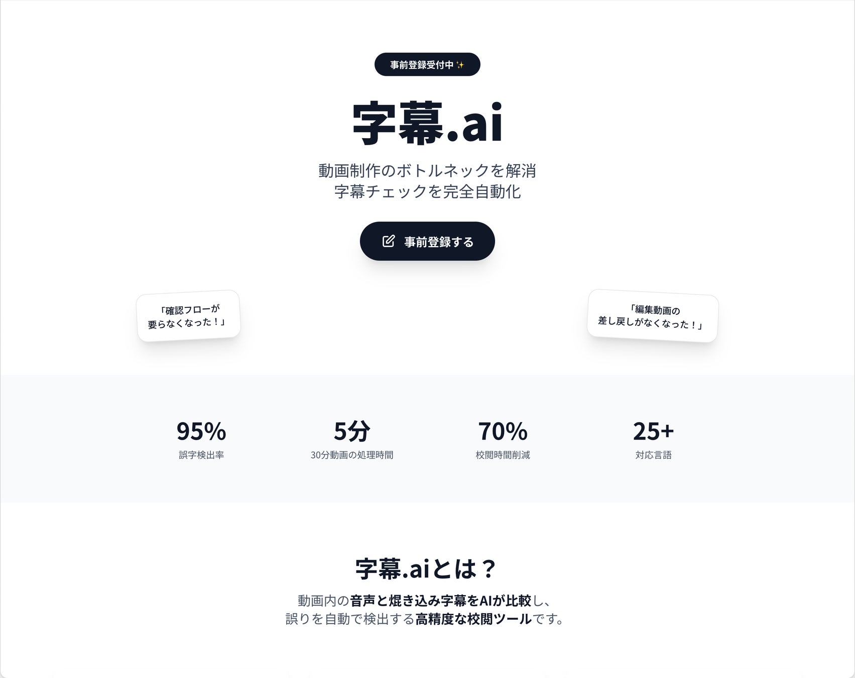 音声とテロップをAIで照合し、誤字やズレを自動検出する校閲ツール。精度95%で30分動画を5分で解析し、作業時間を約70%削減。25言語以上に対応し、字幕生成ではなく「最終検品」に特化した独自の価値を提供し、プロの制作現場の工数を劇的に削減。