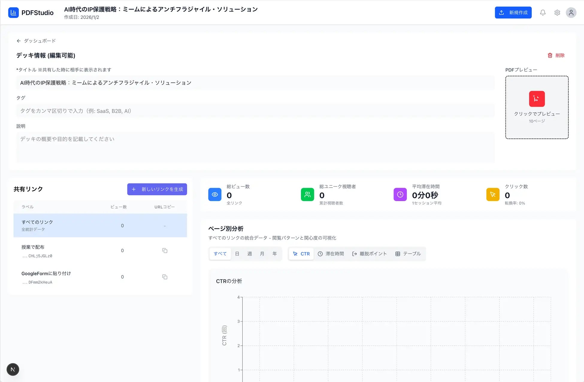 資料の閲覧状況を可視化する分析ツール。ページごとの滞在時間や離脱箇所、CTRを把握でき、共有リンクで「誰が熱心に読んでいるか」を特定可能。リアルタイムな反応を基に最適なタイミングでフォローできるため、成約率を向上させ、商材の売上を最大化。