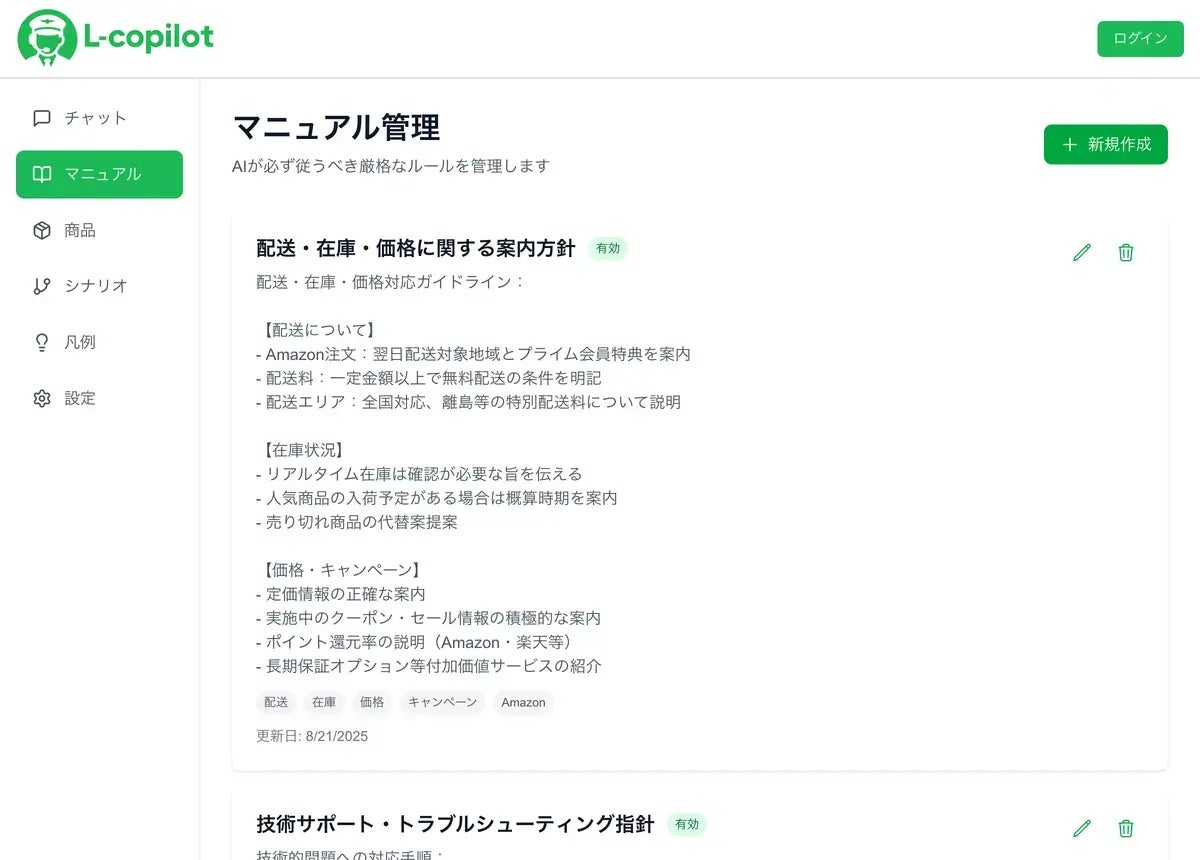 LINE公式アカウントでの顧客対応をAIが支援する管理ダッシュボード。企業固有のマニュアル等を学習し、AIが状況に応じた複数の回答案を即座に作成。人間がAIの案を選択・編集する「副操縦士」の役割を重視しており、新人でもベテラン級の質の高い接客と効率化を両立。