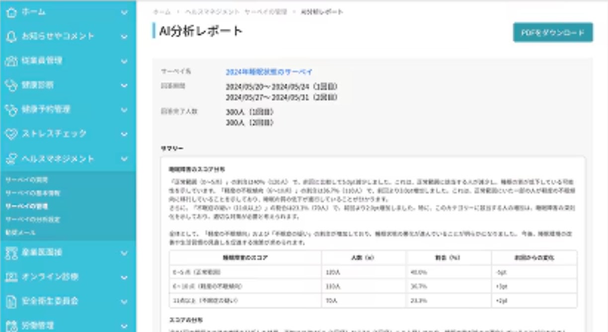 本機能は、従業員の健康データの分析から得られた気付きを社内に報告して課題に対する打ち手を検討し実行する健康管理ご担当者の報告書作成の負担を削減し、改善策や打ち手の検討に集中する支援をすることを目的に開発いたしました。