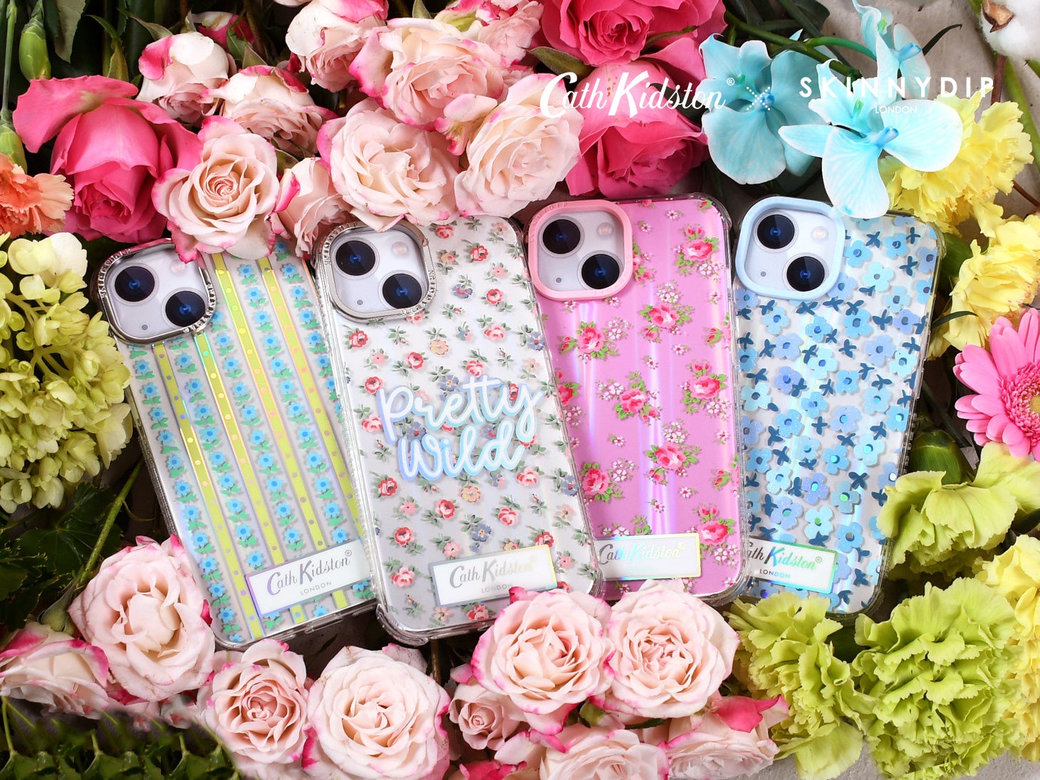 本コレクションでは、Cath Kidstonが誇るオリジナルのフローラルパターンやアイコニックなモチーフを、SKINNYDIP LONDONらしいグリッターやホログラフィック素材と掛け合わせることで、新たな視点で再解釈しました。