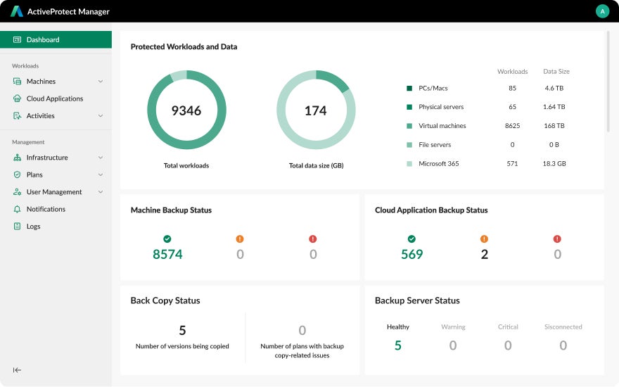 ActiveProtect はハードウェアとソフトウェアをシームレスに統合し、従来の統合型バックアップソリューションと比較して総所有コストを大幅に削減します。最大 150,000 ワークロードを 2,500 拠点にわたり一元的に保護し、仮想マシン、サーバー、データベース、エンドポイント、SaaS サービスをカバーします。WORM、エアギャップバックアップ、自己修復型整合性チェックなどの高度な機能により、ActiveProtectは進化するサイバー脅威に対して包括的なセキュリティを提供します。
