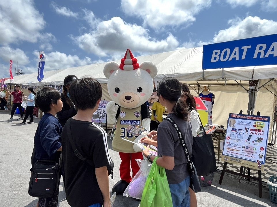 BOAT RACEのマスコットキャラクター「クマホン」がブースに登場。記念撮影が可能です。