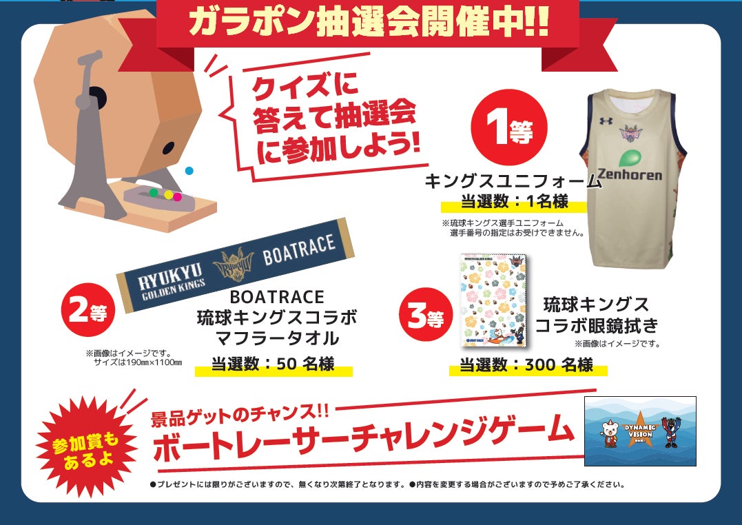 スマホからクイズに参加いただいた方を対象に、ガラポン抽選会を実施します。1等の「琉球ゴールデンキングスユニフォーム」のほか、BOATRACEオリジナルグッズなど、豪華賞品がをご用意しております。※抽選はクイズ参加後、スマートフォン画面をご提示いただいた方に限ります。