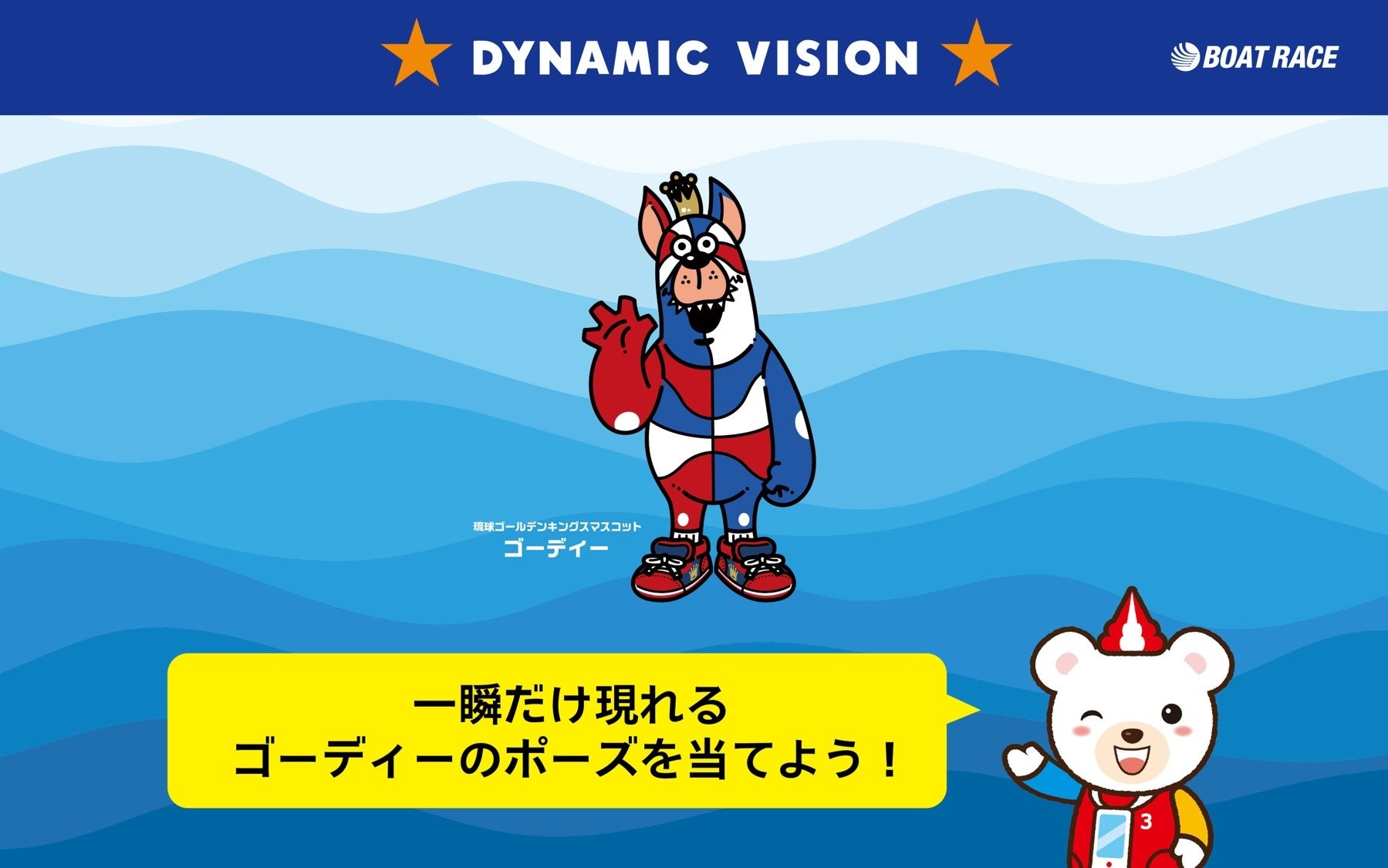 BGMに合わせて一瞬だけ現われるゴーディー(琉球ゴールデンキングスマスコットキャラクター)のポーズを極めるゲームを行います。参加した方にはボートレースオリジナルグッズをプレゼントします。