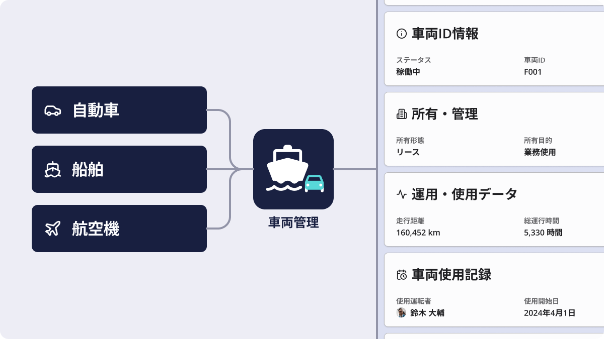 「車両管理/Fleet」は、車両・船舶・航空機といった資産を一元管理できるプロダクトです。種別が異なる車両を同じ台帳で、同じ見た目、同じ操作方法で管理することができます。所有・運用・整備といった車両全般の共通項目に加えて、資産種別ごとの法定管理項目や技術情報項目を統合的に管理することで、拠点・部門・用途・資産種別を横断した可視化を実現します。
