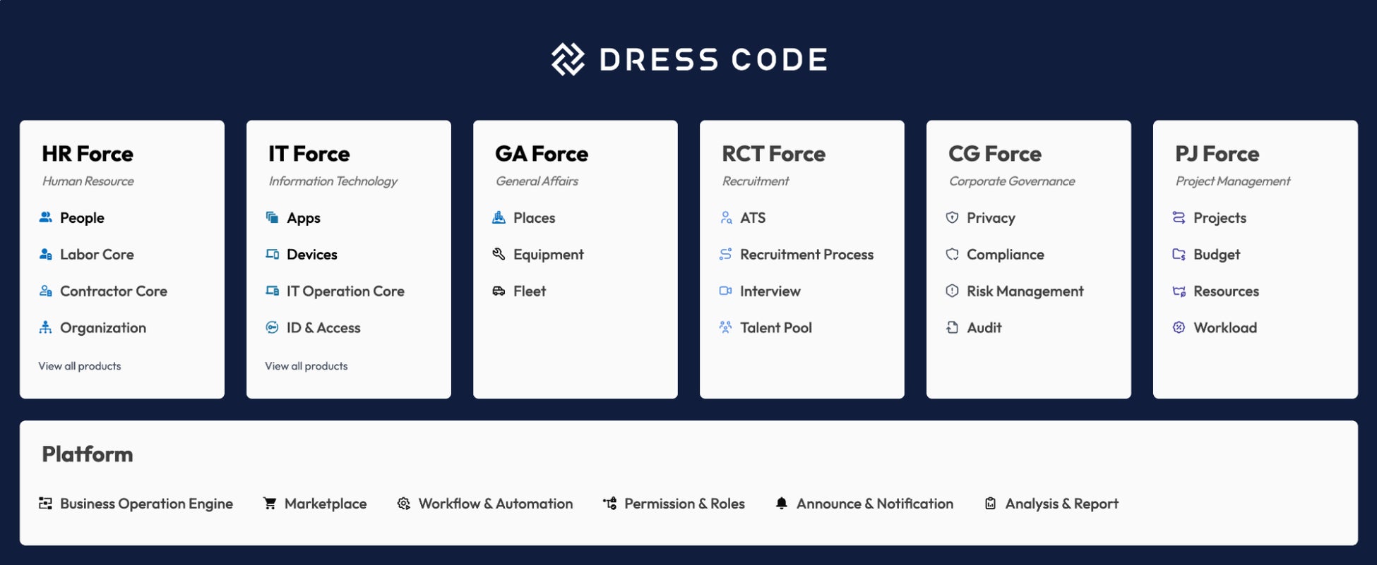 「DRESS CODE」は、人と業務に関する構造的な摩擦を解消する、ワークフォースマネジメントプラットフォームです。企業内の人事・情報システム・総務など“人”に関わる業務は、部門ごとにツールや台帳、プロセスが異なり、属人化・重複作業・情報の分断といった非効率が常態化しています。こうした“摩擦”を抜本的に見直し、業務を横断的・持続的に最適化するために生まれました。