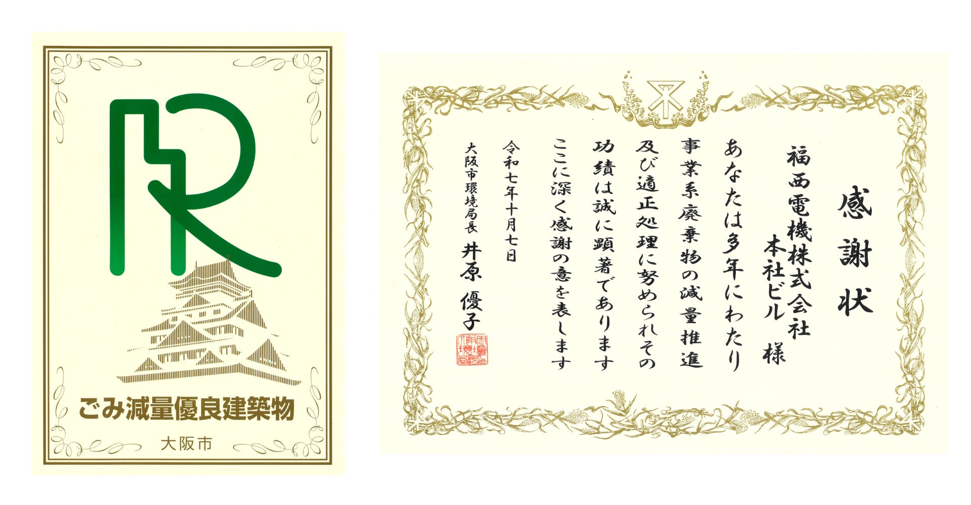 福西電機株式会社(本社:大阪府大阪市、代表取締役社長:岩本秀宣、以下、福西電機)は、このたび、本社ビル(大阪市北区)における継続的なごみ減量の取り組みが評価され、大阪市より「令和7年度ごみ減量優良建築物 環境局長表彰」を受賞しました。