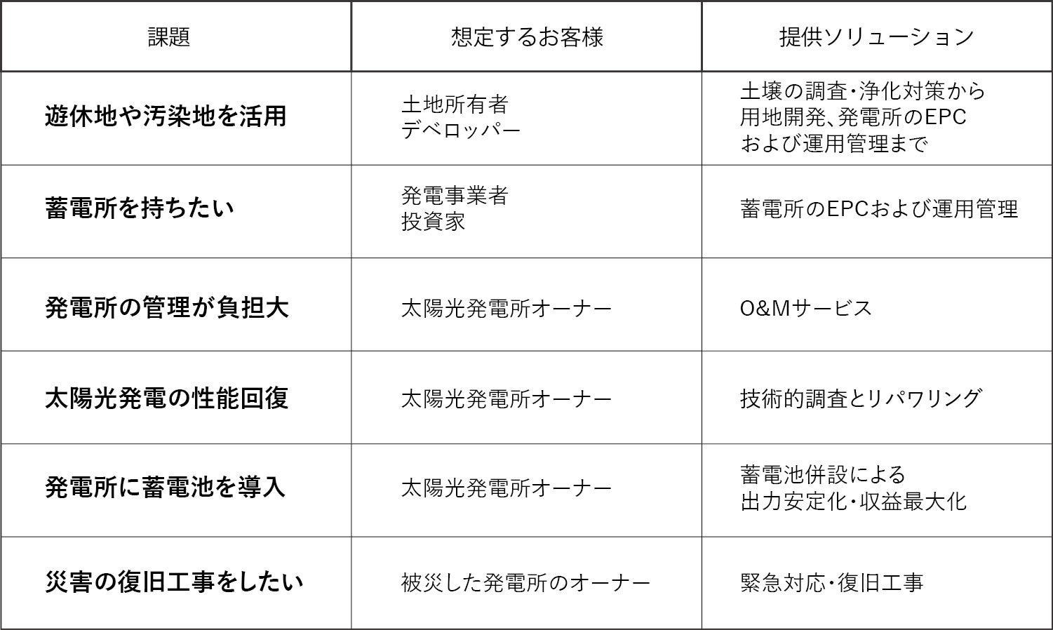 蓄電所・太陽光発電所のEPCにとどまらず、O&M(運用管理・保守)、リパワリング(経年劣化した発電設備を最新機器に更新し性能を回復させること)、蓄電池の併設による発電出力の安定化、さらには災害からの復旧対応まで、発電・蓄電に関わる幅広い課題にワンストップで対応できます。「蓄電所を持ちたいが土地の取得がネックになっている」というお客様には、開発用地から設備提供までパッケージでご提案することも可能です。
