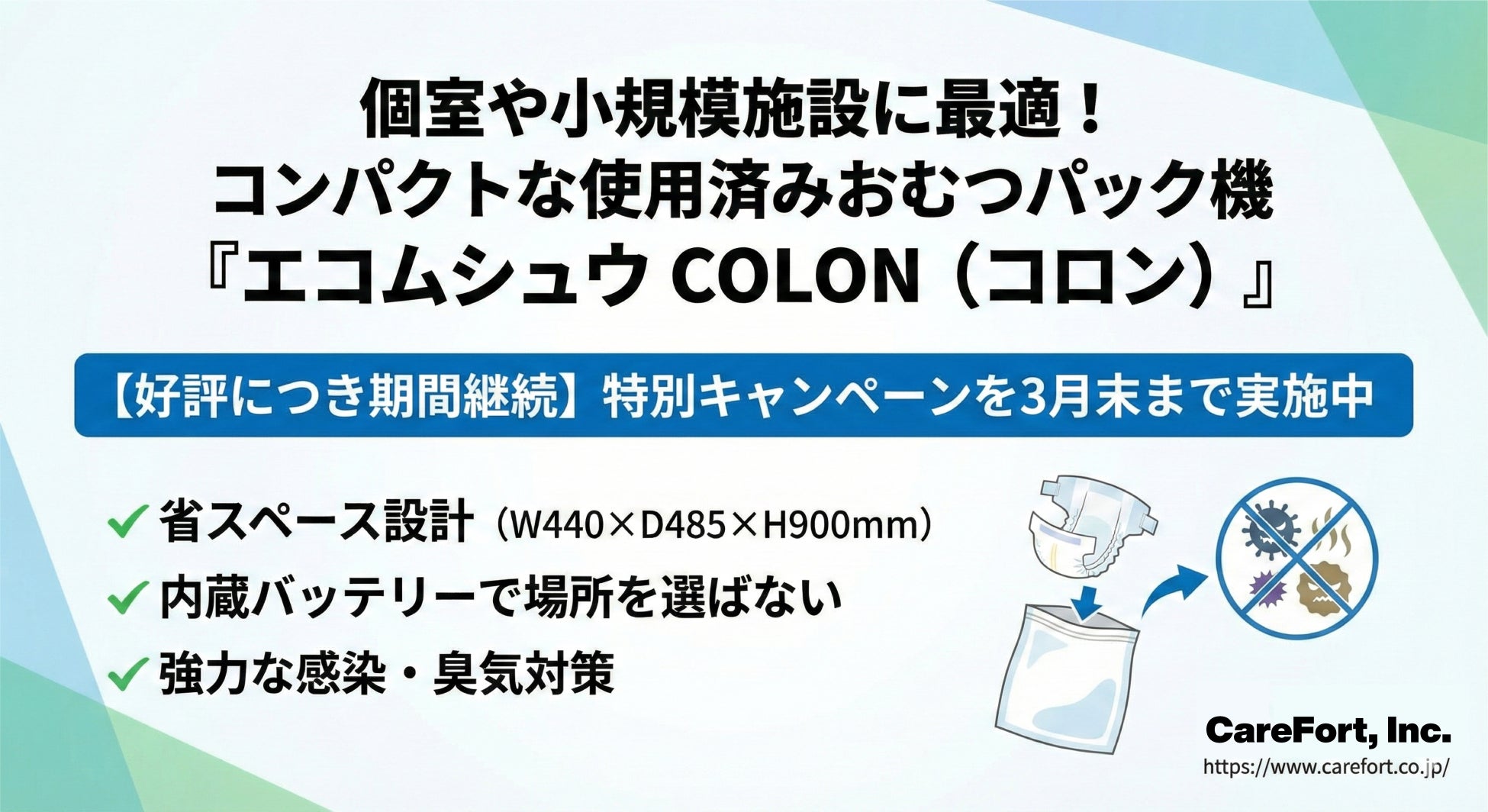 ケアフォート株式会社(本社:東京都千代田区、代表取締役:春山泰三)は、医療・介護・保育の現場で感染対策と臭気対策を同時に実現する使用済みおむつパックシステム「エコムシュウ コロン」の特別キャンペーンについてお知らせいたします。