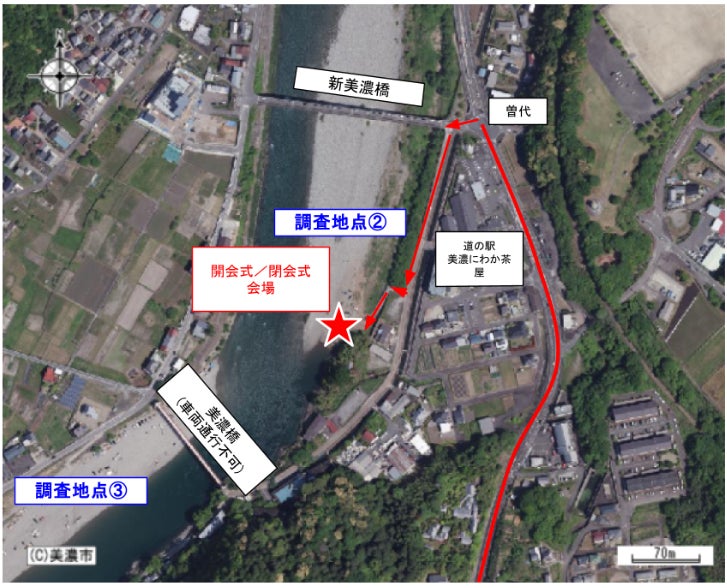 9:15~ 受付開始(道の駅 美濃にわか茶屋 西側河川敷) 9:30~ 開会式、内容説明、安全確認 9:45~ 各地点へ移動 10:00~ 調査のためのごみ拾い開始 11:45~ 閉会式、集合写真 〈調査地点〉 ①曽代 左岸(美濃市曽代) ②にわか茶屋 左岸(美濃市曽代・道の駅 美濃にわか茶屋 西側河川敷) ※開会式/閉会式会場 ③美濃橋 右岸(美濃市前野) ④下渡橋 右岸(美濃市横越) ⑤山崎大橋 左岸(美濃市生櫛) |