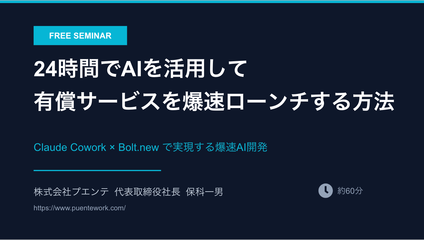 株式会社プエンテ(本社:埼玉県所沢市、代表取締役:保科一男)は、AI活用によるサービス開発の実践ノウハウを公開する無料オンラインセミナー「24時間でAIを活用して有償サービスを爆速ローンチする方法」を2026年4月13日(月)にオンライン開催いたします。参加申込はPeatix(https://peatix.com/event/4945294/view)にて受付中です。