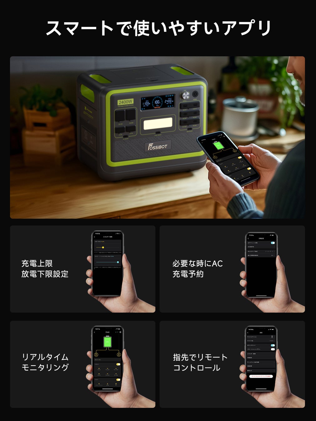 専用のFOSSiBOTアプリから充電・給電状況の確認や、遠隔で入力スピードの操作が可能です。本体への充電タイミングも予約可能で、電気代が安くなる夜の間に充電をし、高くなる昼間に使用するなどの節電にも活用いただけます。