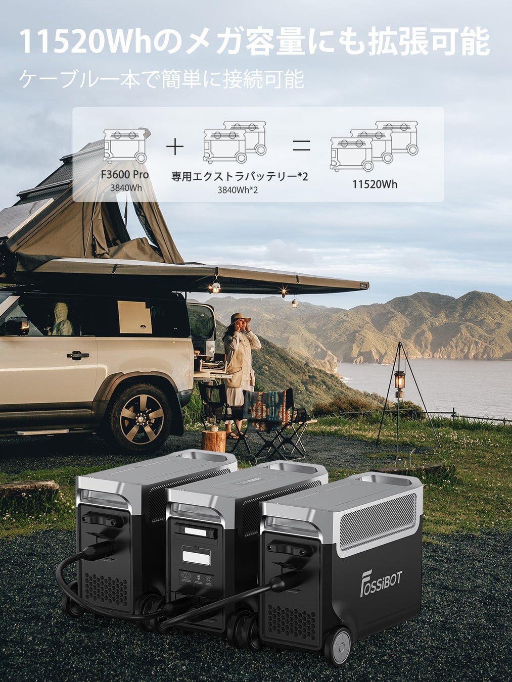 FOSSiBOT電池容量拡張技術により、最大3つの拡張バッテリーに接続でき、電気容量を3840Whから11520Whまで自由に選べます。FOSSiBOT AC並列機技術を採用、付属されたケーブルを介して2台 ポータブル電源 3600Proを並列使用する場合、3300Wの定格出力と6600Wの瞬間最大出力を実現し、電化製品はほぼすべて稼働できます、拡張バッテリーも同時利用する場合、ポータブル電源の容量が最大11520Whに拡張できます。