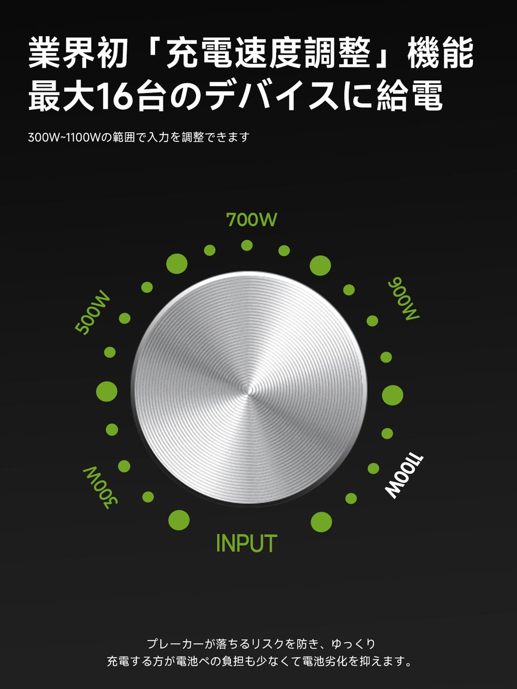 FOSSiBOTの独自技術により、充電入力は使用ニーズに応じて、300W~1100Wの5段階で選択できます。急速充電はもちろん、バッテリー性能を保護し、寿命を延ばすためにやピーク時間帯でブレーカーを落とさないようにする場合は、低速充電にも対応します。そして、キャンプ場などの電力制限がある場所でもAC充電ができるので、単一の充電電力の市販品と比べると活用します。