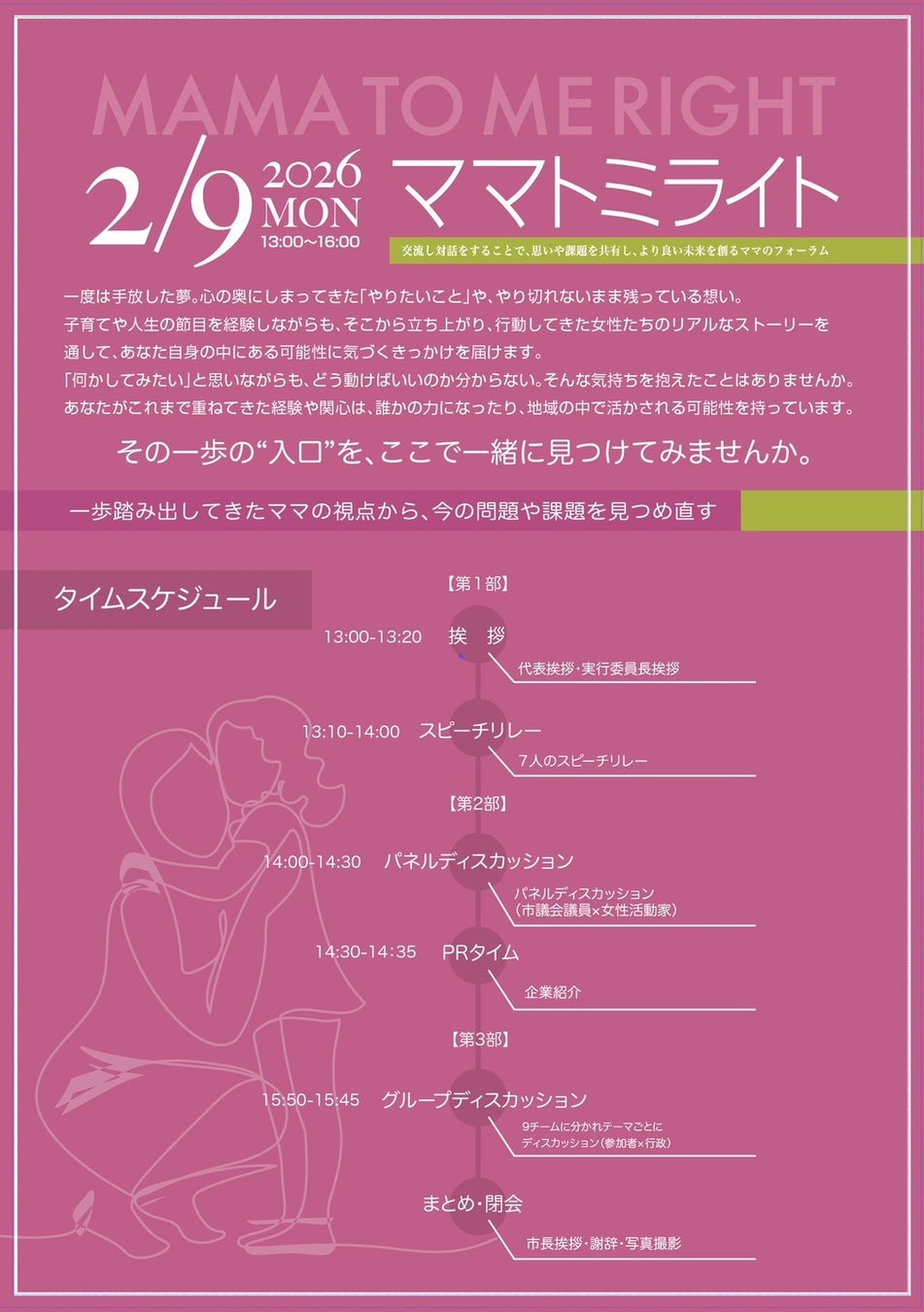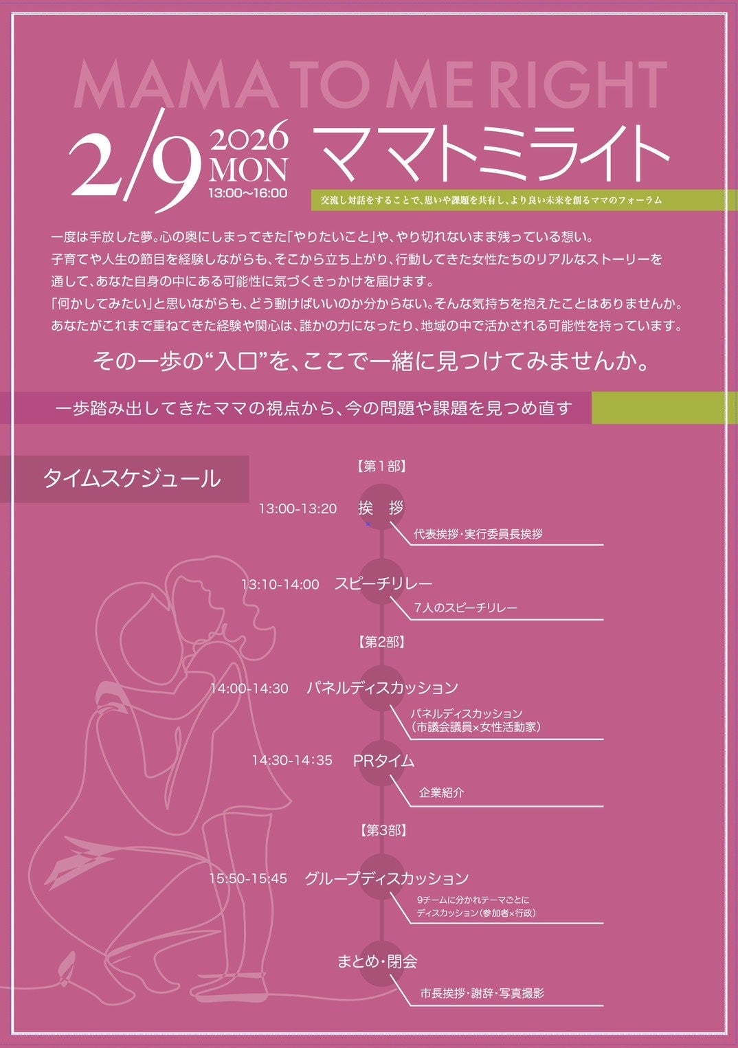 本フォーラムは、子育てやライフステージの変化の中で「一歩踏み出したい」と願うママたちの声を起点に、行政・地域・社会をつなぐ対話の場として企画・実施されたものです。