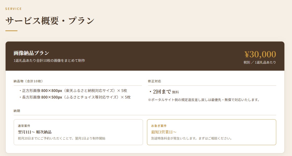 業務プロセスの標準化により、1返礼品(10画像)3万円という低価格かつ明快な料金体系を実現しました。
