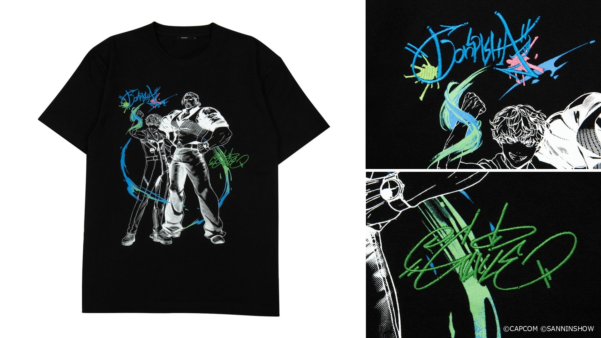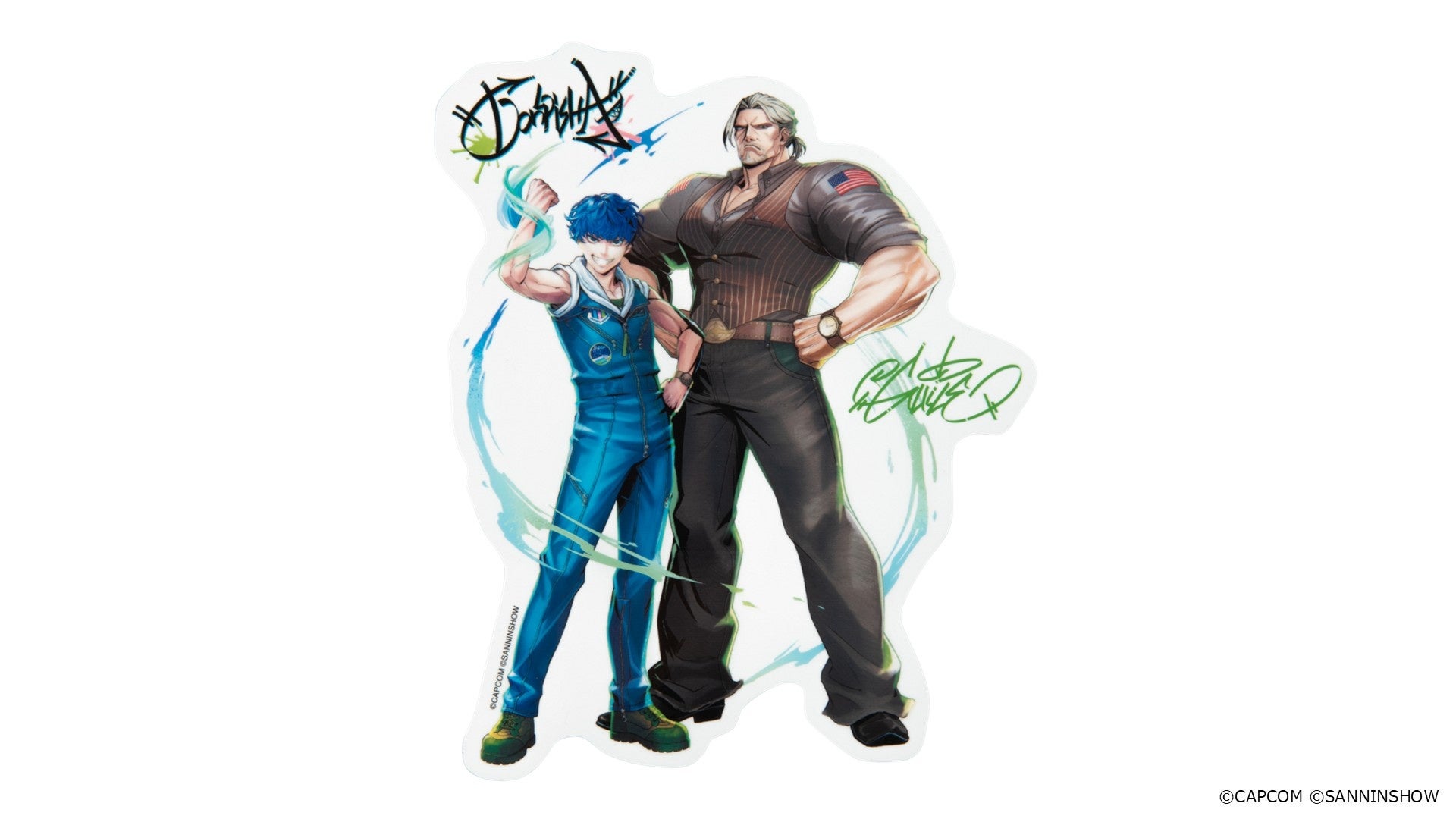 『ストリートファイター 6×ドンピシャ×GRAPHT』描き下ろしアートをTシャツ、トラベルビッグステッカーに展開。Tシャツは、アートをシンプルにプリントで再現し、ドンピシャとガイルのグラフィティサインを刺繍で表現しています。購入特典として特製アクリルキーホルダー付き。