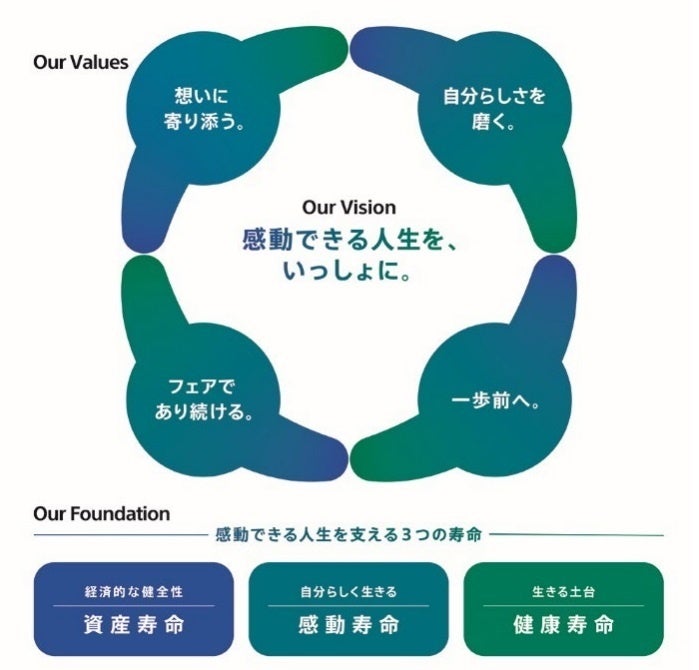 ソニーグループにおいて“人を支える”事業を担う私たちソニーFGは、生きる土台である「健康寿命」と、経済的な健全性である「資産寿命」に加えて、“自分らしく生きる”ことを「感動寿命」と定義しています。この 3つの寿命を礎に、人生における楽しさと不安の両面からお客さまに寄り添い、支える、そんな存在であり続けることを目指して、『感動できる人生を、いっしょに。』を Our Vision(私たちのありたい姿)として掲げています。