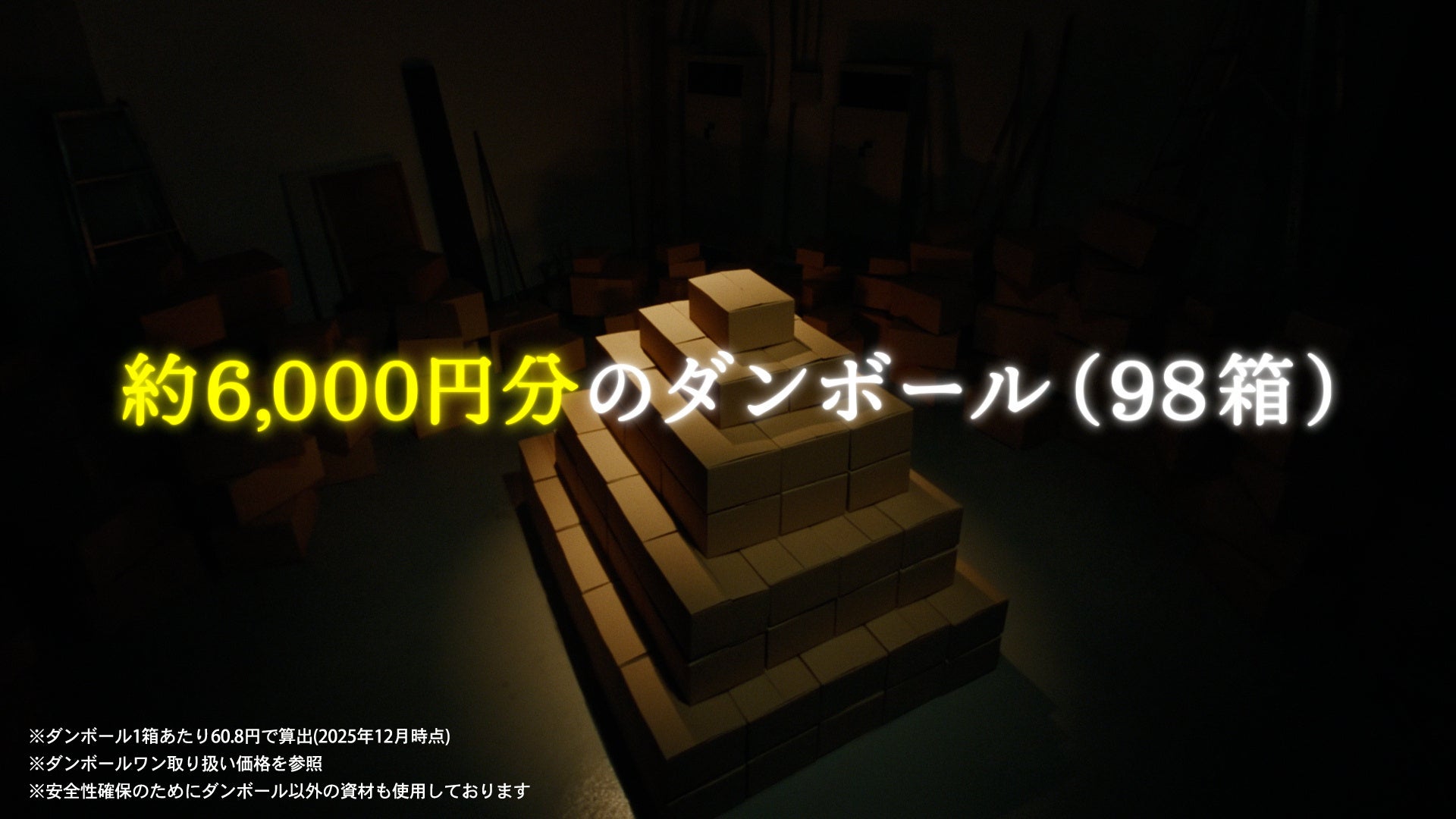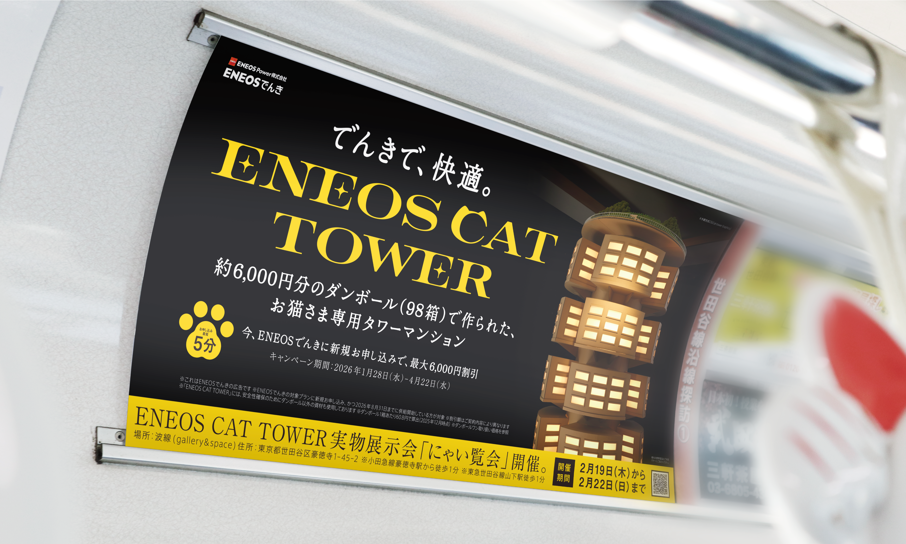 猫の日が近づく2月は、新生活の引っ越し準備も本格化する季節です。そこでENEOSでんきは、最大6,000円割引の価値を引っ越し・新生活準備の必需品でもあるダンボール98箱※1分を使用し、可視化。全高2.3m全幅1.5mの“お猫さま専用タワーマンション” 「ENEOS CAT TOWER(エネオスキャットタワー)」を竣工させました。前作から続く「でんきで、快適。」のコンセプトを受け継ぎ、タワマン広告風の語彙で、猫の“快適”を物件として表現しています。