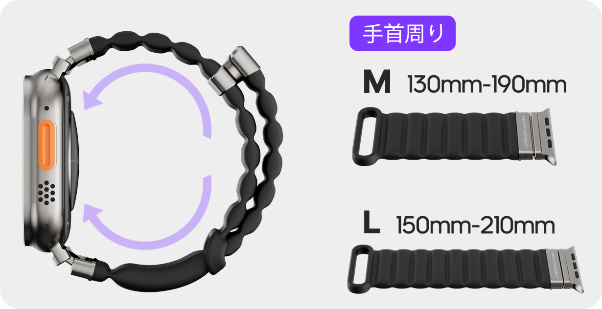 38mmから49mmまで様々なApple Watch機種に対応。バンドの長さも2サイズ展開で、男性にも女性にも快適にフィットします。