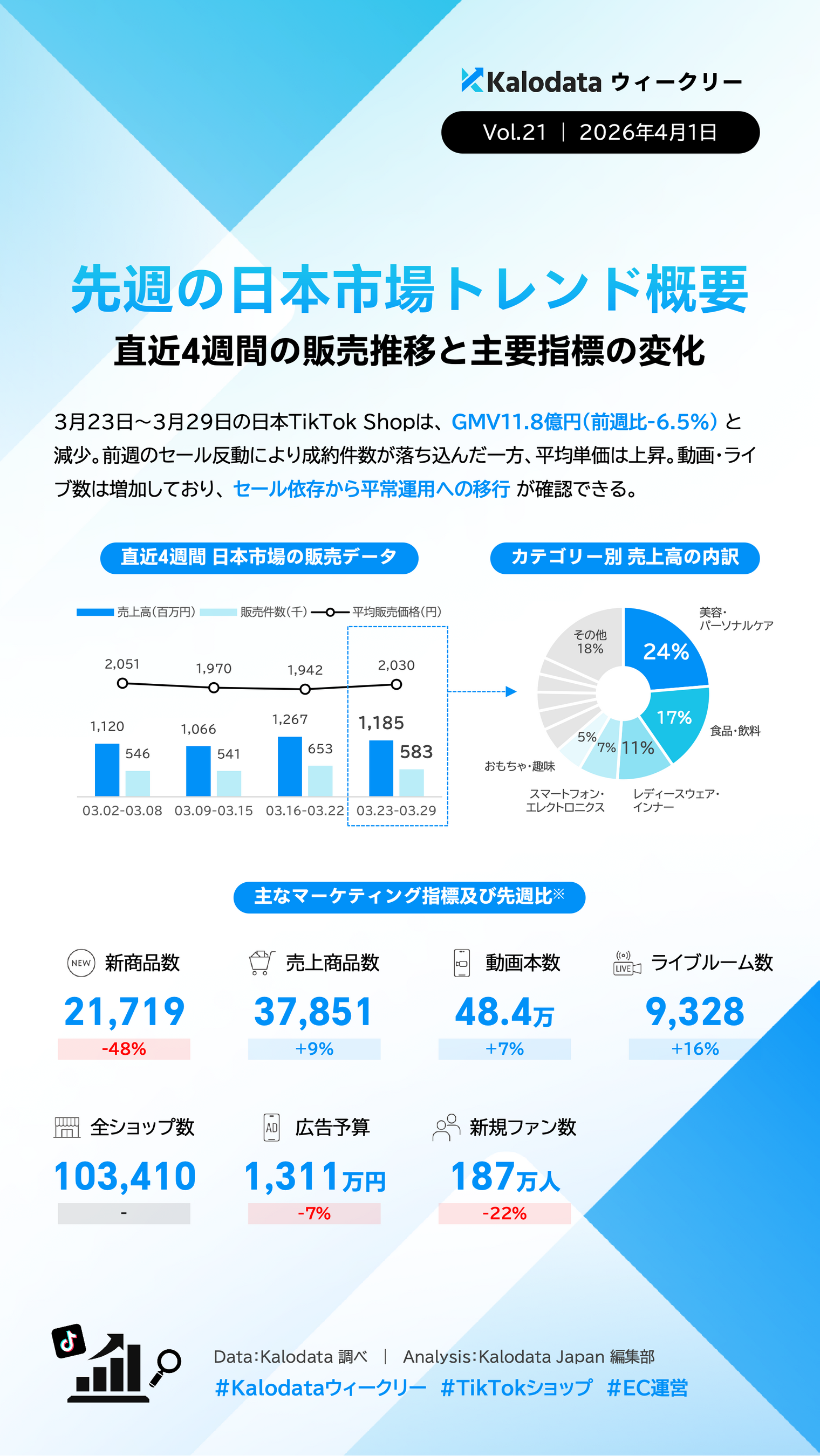 【Kalodataウィークリー】日本TikTok Shop市場、セール反動でGMV11.8億円に減少も販売活動は活発化 平常時の勝ち筋が明確に(2026年3月23日週)