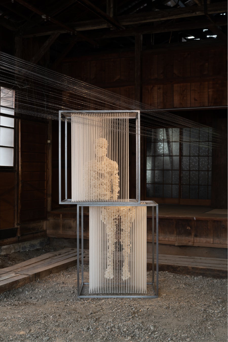 東京造形大学テキスタイルデザイン専攻を卒業。2024年4月に自身初となる個展をSOM GALLERYにて開催。黒瀧は、繊維が交差することで立体的な構造が生まれる織物の造形に着眼を得て、手作業を通じた経糸と緯糸の組み合わせを用いた、立体作品を制作しています。彼の代表作である、「Human」シリーズでは、規則的な糸の配置で構成されるフレームの中に人間を閉じ込めることで、パターン化された現代社会や人間の思考を浮き彫りにさせます。彼は自身の作品を通じて、空虚な現代社会や彼が捉える人間の視点を浮かび上がらせ、人々をアルゴリズムからの解放へと導くことを試みます。