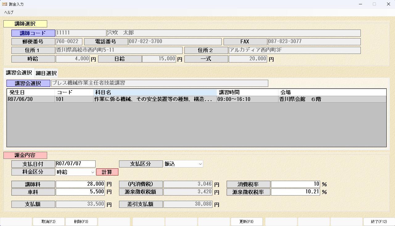 • 複雑な税額計算の自動化: 講師ごとに設定された単価(時給・日給・一式)に基づき、謝金額、消費税、源泉徴収税額をシステム内で自動算出します。