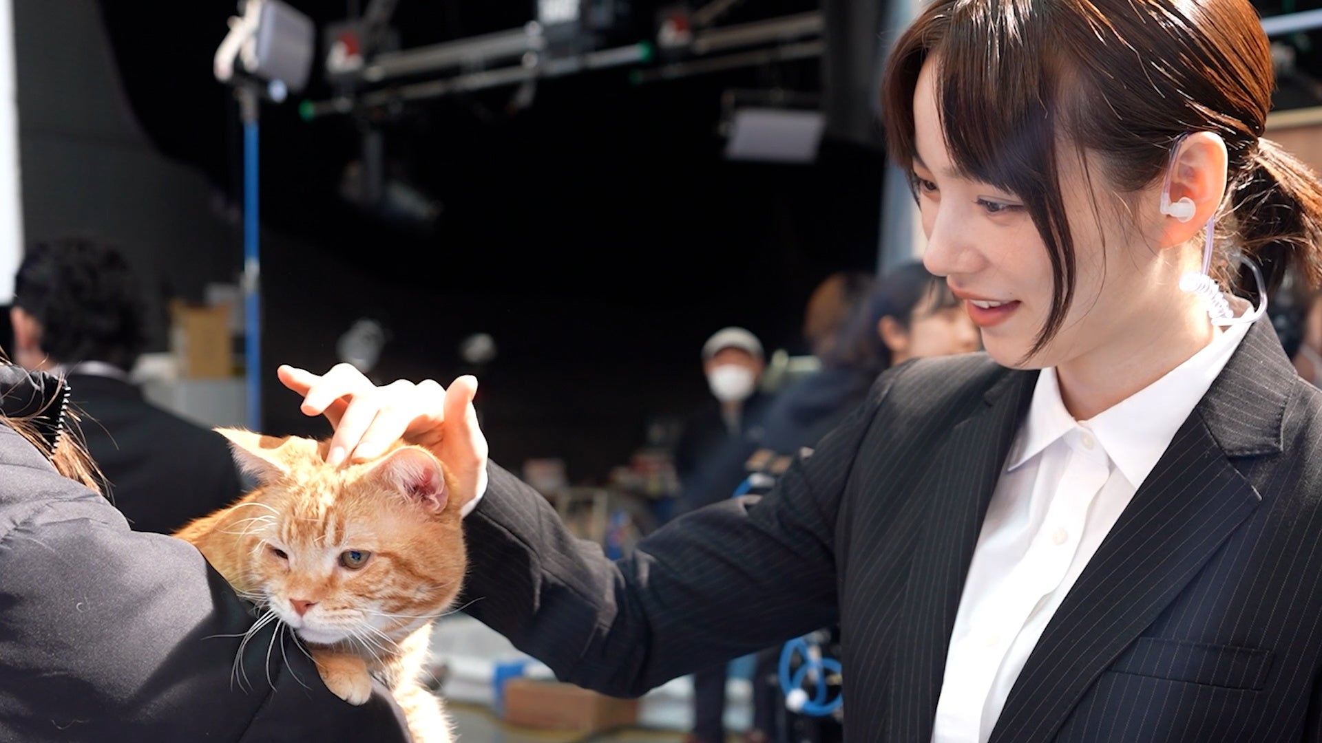また、のんさんは怪しげなスーツ集団と笑顔で振り付けを踊るシーンにも挑戦し、作品のコミカルな世界観を表現。さらに、「クロじゃなくてゼロでしたね!」というセリフを、思わず「ゼロじゃなくてクロでしたね!」と言い間違えてしまう可愛らしい一幕もあり、現場は笑いに包まれました。撮影の合間には、CMに出演する猫(名前:オレンジ)に「のんと申します。頑張りますので何卒……」とあいさつをし、戯れる微笑ましい様子も見られました。オレンジの愛らしさに、のんさんや撮影スタッフまでもが癒される姿も印象的です。
