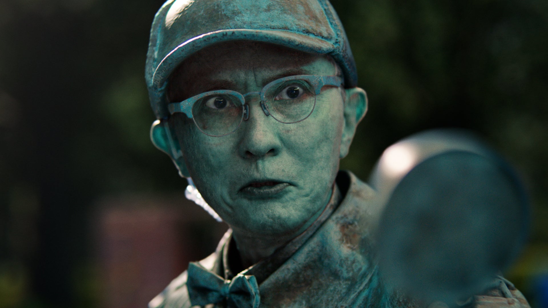 公園を舞台に、ピクニックを楽しむ怪しいスーツ集団を発見した“ゼロ配刑事”コンビ。のんさんは木の陰に身を潜め、松重さんは銅像に扮して台座の上から張り込みます。スーツ姿の集団が「そろそろデザート来るぞ」と口にすると、のんさんは「何かの隠語ですかね」、松重さんは「これはクロかもしれんぞ」と色めき立ちます。