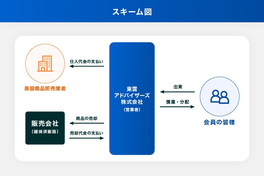 本ファンドでは、東雲アドバイザーズ株式会社(営業者)が、美容商品卸売業者を通じて、日常的に需要の高い化粧品や日用品等を取得し、その後、既に確保されている販路を通じて、速やかに売却を行います。売却代金をもって投資家の皆さまへ償還・分配を行います。