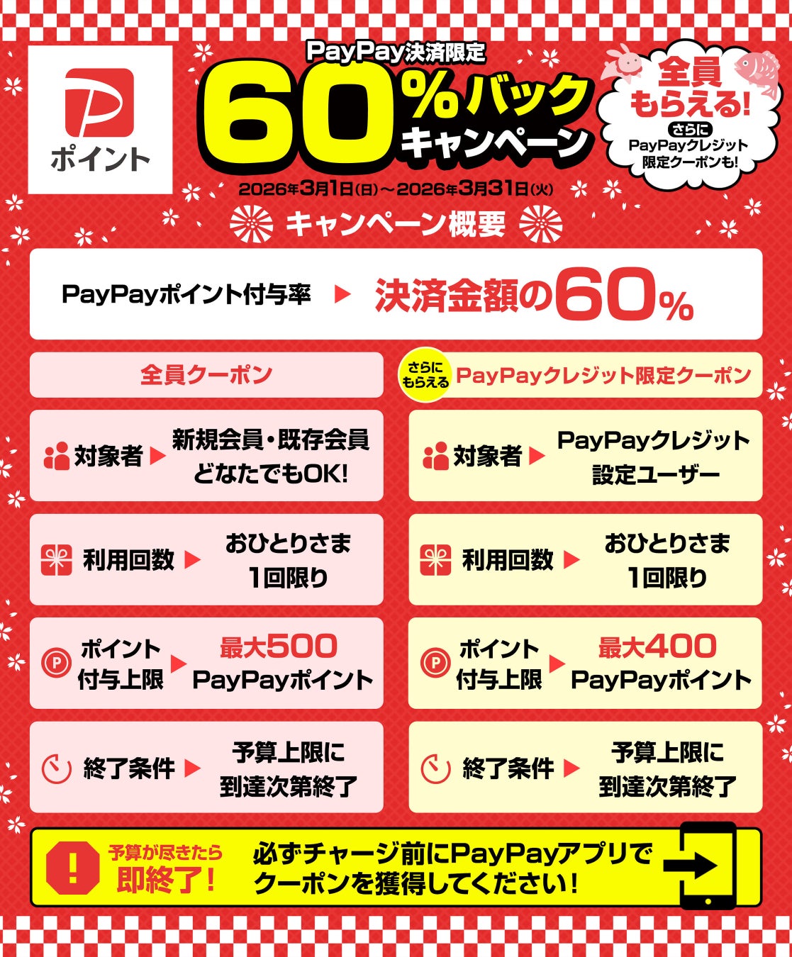 予算到達で即終了!全員もらえる最大500ptバックに加え、PayPayクレジット限定クーポンも登場する春の特大ポイントバック祭