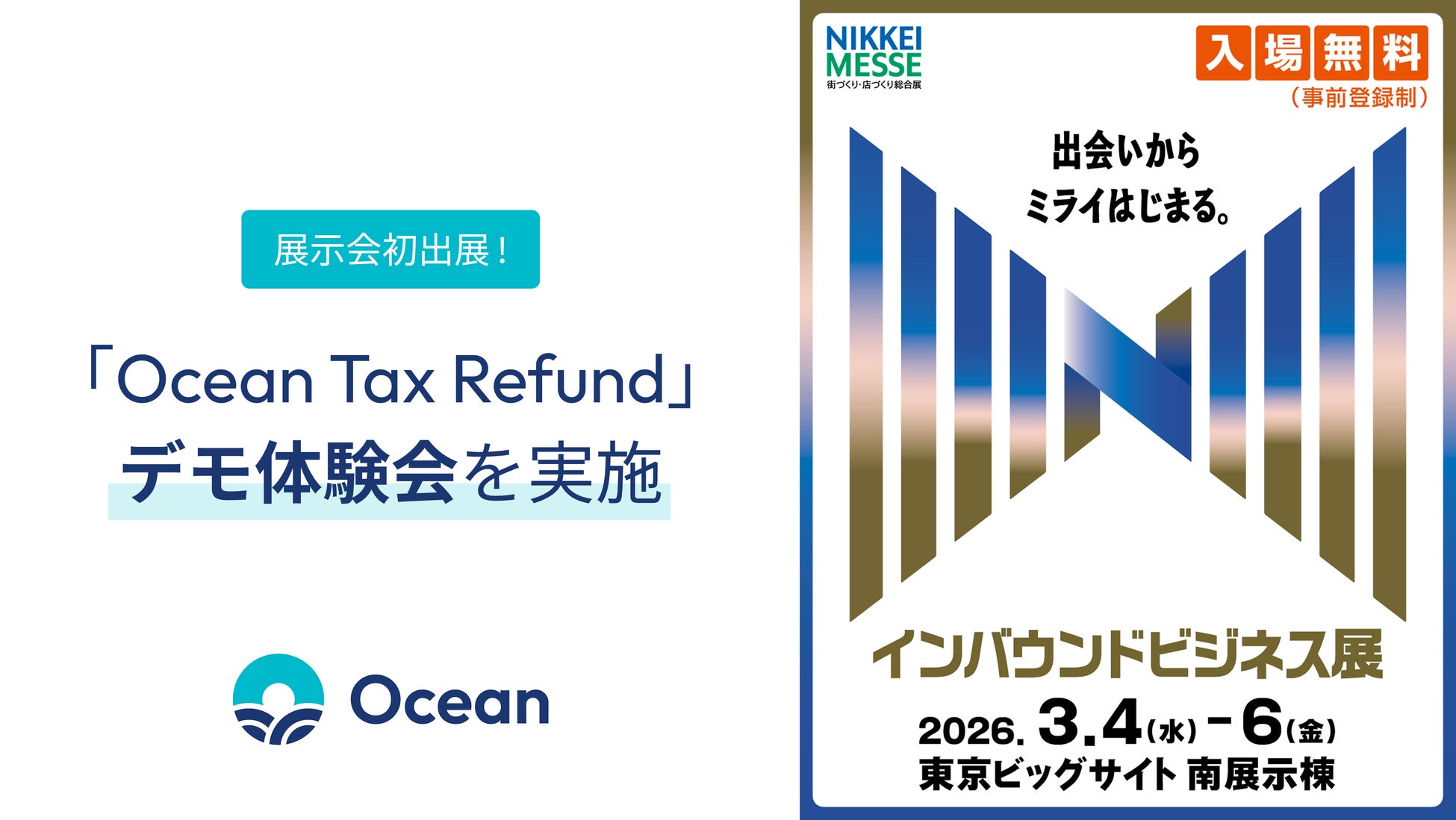 株式会社Ocean(本社:東京都中央区、代表取締役:星野 遼、以下「Ocean」)は、2026年3月4日(水)から6日(金)に東京ビッグサイト南ホールで開催される「第3回インバウンドビジネス展」(主催:日経BP)に出展することをお知らせします。今回の出展はOceanとして初めての展示会出展となり、「Ocean Tax Refund」を実際にご体験いただける機会です。また、3月5日(木)には、参加無料のワークショップに代表・星野が登壇いたします。