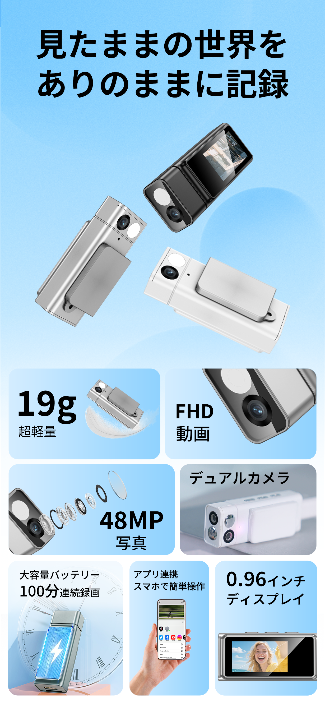 3.7V 260mAhのリチウムバッテリーを内蔵し、コンパクトながら100分間連続録画を実現しました。 ハイキングの山頂までの道のり、ストイックなワークアウト、そしてクリエイティブな撮影セッション。途切れることのない記録が、あなたの情熱を余すことなく保存します。充電切れを心配せず、目の前のアクティビティに全集中しましょう