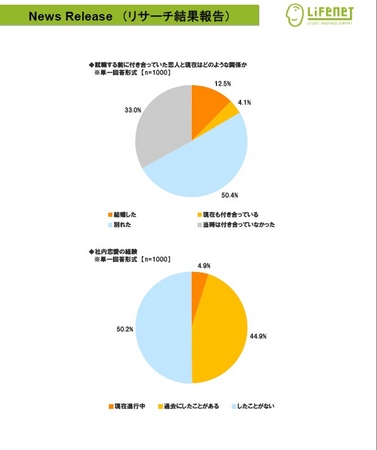 20代から50代の有職者の男女1000名(男性500名、女性500名)に対し、就職する前に付き合っていた恋人と現在どのような関係になっているかを単一回答形式で聞いたところ、12.5%の回答者が「結婚した」と回答し、4.1%の回答者が「現在も付き合っている」と回答し、「別れた」と回答したのは50.4%となりました。